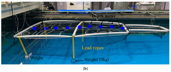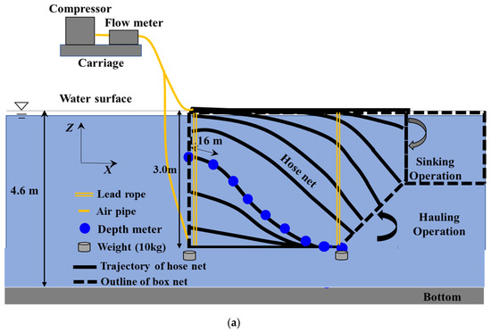 The water tank tests were conducted in the ocean engineering basin at the University of Tokyo. The dimensions of the water tank measure 50 m in length and 10 m in width, and it has a water depth of 5 m. The water tank is equipped with a floor that can be elevated to adjust the water depth, offering a range from 0.4 m to 5.0 m. For our experiments, the water depth was maintained at 3.0 m in the hose net test and changed to 4.6 m when the hose net was set in the box net, to facilitate the full deployment of the box net. To minimize the space between the hose net and the box net, the hose net was attached to a weighted line (lead rope) at four distinct points to restrict horizontal movement (Figure 5). To capture the shape of the hose net as it ascended, depth meters were strategically positioned at nine locations. The depth meters were DEFI2-D10 from JFE Advantech Co., Ltd. (Nishinomiya, Hyogo, Japan). Their measurement range is 0~1 MPa, 0~100 m, their resolution is 0.0001 MPa, 0.01 m, and their accuracy is ±1.0%FS at 25 °C. While we contemplated installing depth meters in the width direction as well, it was observed that the shape remained relatively constant during floating-up. Consequently, data acquisition was limited to the longitudinal direction, with readings recorded at 1 s intervals. The specific installation locations are indicated by blue dots in Figure 5. The speed of the injected air is 0.57 L/s from the air compressor.