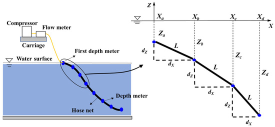 The two-dimensional geometry of the hose net was approximated by analyzing depth meter measurements taken at several positions, which provided both X and Z coordinates for the hose net. The Z-coordinates were directly acquired from the depth meters, while the X-coordinates of these measurement points were derived by assuming that all horizontal displacements occurred exclusively in the X-direction and that a straight-line connection existed between any two given (Figure 6). Using the first point on the air input side as the reference point (origin), it was feasible to calculate subsequent horizontal displacements by determining the distance between any two depth-meter positions [4].