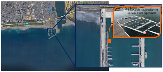 Set nets are typically positioned several hundred meters or more from the coastline and are subject to the influences of natural elements like waves and currents. Therefore, it is imperative not only to conduct experiments in the water tank but also to gain insight into their behavior in natural surroundings. However, due to the practical constraints arising from the size of the model used in this study, conducting experiments in the open ocean proved to be challenging. As a result, the experiments were carried out in a relatively calm natural environment. The semi-field experiment was executed at a corner of the pier located at Hiratsuka New Port in Hiratsuka City, Kanagawa prefecture, Japan, as shown in Figure 7. The same models and set-up methods used in the water tank test were replicated for this experiment. Moreover, depth meters were positioned at identical locations within the hose net, as shown in Figure 5.