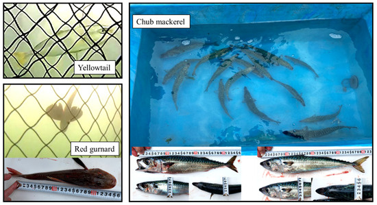 In order to assess the catch-hauling performance, experiments were conducted using live fish. Specifically, we obtained 2 yellowtails (Seriola quinqueradiata), 2 red gurnards (Chelidonichthys cuculus), and 16 Chub mackerels (Scomber japonicus) from set nets located in the Hiratsuka open sea, as depicted in Figure 8 and Table 3. The experiment included fish within a body length range of 270 mm to 422 mm.