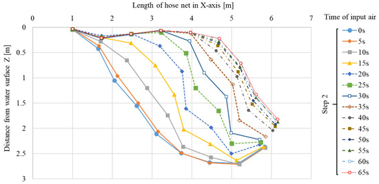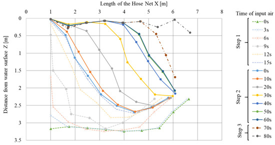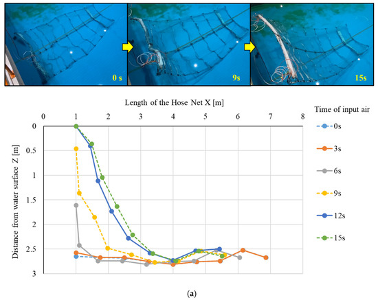 Figure 10a presents the time series of the first step. During this phase, when the air was exclusively injected into the auxiliary hose, the auxiliary hose along with the hose net on the air input side ascended to the water’s surface within 15 s, while the rear side remained on the bottom. This implies that the box net could be closed within 50% of the time compared to using the hose net alone. Following the completion of the first step, air was injected into the hose net. It took 50 s for the hose net to ascend entirely to the surface, almost the same amount of time as that taken by hose net without the auxiliary hose. It is also evident that the shape of the hose net during flotation is smoother compared to what is depicted in Figure 9. The third step, the air injection into the auxiliary hose on the rear side, started at 50 s to assist the floating-up on the rear side.