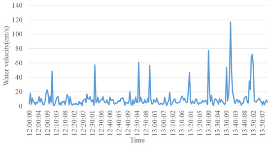Given the location within a fishing port, the significant wave height during the actual measurement period was 0.05 m. Furthermore, the recorded results of the flow speed in the surrounding area during the experiment are illustrated in Figure 12. To statistically calculate the flow velocity, first, the average value and standard deviation were calculated. Then, the average value and standard deviation were recalculated considering only the observed values within the range of “average value ± 3 × standard deviation”. This process was repeated five times to converge the average value and standard deviation. The maximum flow remained below 17.7 cm/s, with an average flow speed of 6.6 cm/s.