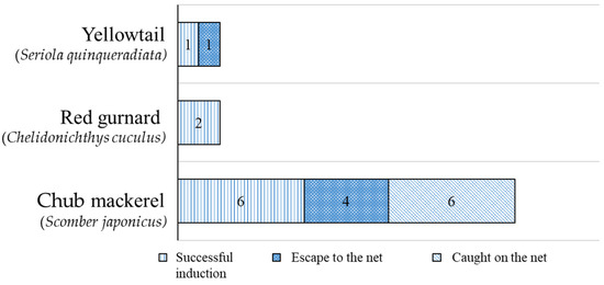 Initially, a limited number of catch-hauling trials were carried out using two red gurnards and two yellowtails. During these experiments, one red gurnard and two yellowtails were successfully cornered into the capture net, as depicted in Figure 14a. However, one red gurnard managed to escape outside the box net through a gap between the hoses and the hose connection. We then conducted an induction experiment with the remaining 16 mackerel. The box net had a larger mesh size, and four fish swiftly passed through the net on introduction (Figure 14b), while six fish became ensnared in the net’s mesh (Figure 14c). Consequently, six mackerel were effectively introduced into the system.