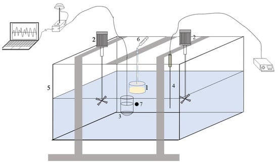 Schematic representation of the experimental facility. (1. Oil containment device; 2. Mechanical agitators; 3. Doppler velocimeter; 4. Temperature control equipment; 5. Cubic container; 6. Syringe for adding oil; 7. Sampling point. The sampling port is a tube connected to a 100 mL syringe).
