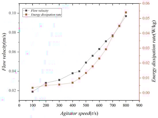 The energy dissipation rate in the test was calculated, as depicted in Figure 2. According to previous studies (Delvigne and Sweeney, 1988 []), the energy dissipation rate of regular waves varies between 10−3 and 10−2 W/kg. It has been determined that by operating the agitator at speeds ranging from 300 to 1000 rpm, the test could effectively simulate waves with an intensity closely resembling that of regular waves.