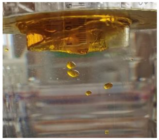 - Turn off the agitator after 3 h. Collect the remaining oil in the oil containment device with a syringe into volumetric flasks, fill to the mark with distilled water, and weigh. Determine the volume of the remaining oil as Voil,2 from the weight difference between the sample and the weight of pure distilled water.