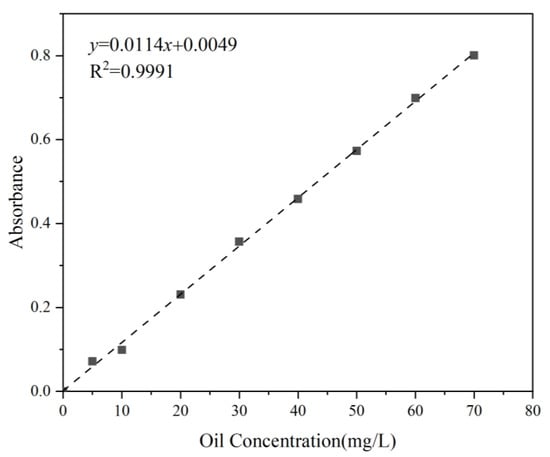 The extraction of petroleum hydrocarbons from the suspension was carried out using n-hexane in a 250 mL separatory funnel, following the China standard test method []. Subsequently, the absorbance of the test samples was measured at 225 nm. The oil concentration standard curve (Figure 4) served as a reference for comparison, enabling the calculation of oil concentration in the water samples.