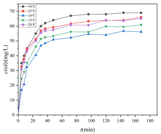 The temporal evolution of oil concentrations in water samples located 10 cm below the oil film under varying water temperatures (10 °C, 15 °C, 20 °C, 25 °C, and 30 °C).