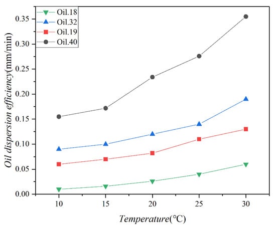 The dispersion efficiencies of 4 test oils (Oil 18, Oil 19, Oil 32, and Oil 40) at different temperatures (10 °C, 15 °C, 20 °C, 25 °C, and 30 °C).