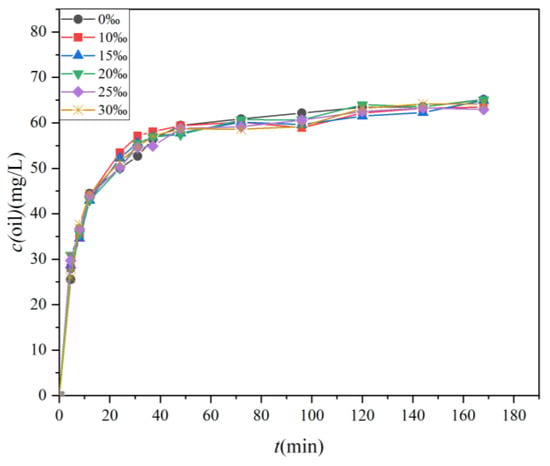 The temporal evolution of oil concentrations in water samples located 10 cm below the oil film under varying water salinity (0‰, 10‰, 15‰, 20‰, 25‰, and 30‰).