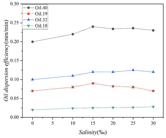 The dispersion efficiencies of 4 test oils (Oil 18, Oil 19, Oil 32, and Oil 40) at different salinities (0‰, 10‰, 15‰, 20‰, 25‰, and 30‰).