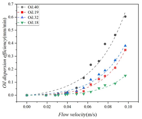 Variation in the dispersion efficiency of the 4 oils (Oil 18, Oil 19, Oil 32, and Oil 40) as a function of the water flow velocity, the scatter points represent the experimental results, and the curves represent the corresponding data fits.