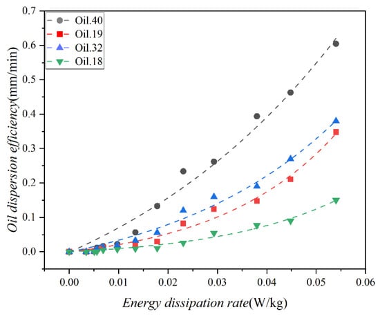 Variation in the dispersion efficiency of the 4 oils (Oil 18, Oil 19, Oil 32, and Oil 40) as a function of the energy dissipation rate, the scatter points represent the experimental results, and the curves represent the corresponding data fits.