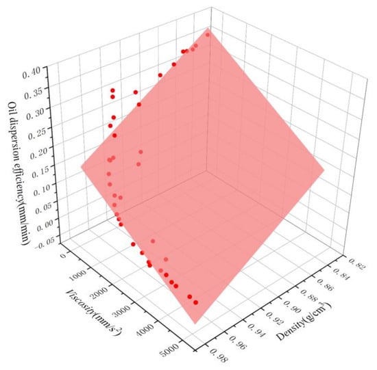 Oil dispersion efficiency of oils as a function of density and viscosity. The scatter points represent the experimental results, while the surfaces represent the corresponding linear regression.