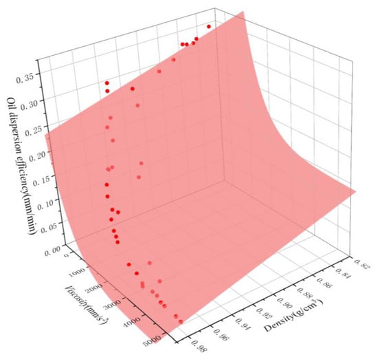 Oil dispersion efficiency of oils as a function of density and viscosity. The scatter points represent the experimental results, while the surfaces represent the corresponding nonlinear regression model fitting.