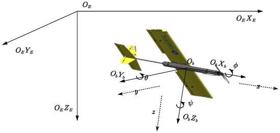 where denotes the vector of the UAAV’s position states and attitude states in ; stands for the UAAV’s velocity vector with being linear velocity states and being angular velocity states with respect to . is defined as