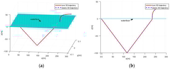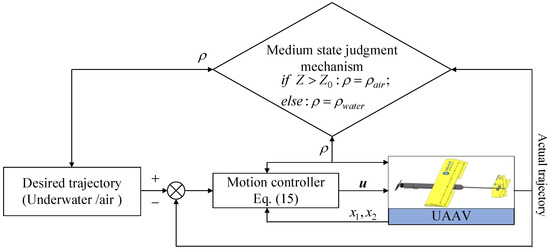 Note: For the motion during moving in and out of media, the model is unchanging. But considering the resistance difference between seawater and air, the control forces need to be changed. Specifically, users can select the appropriate control parameters and to guarantee the system stability to obtain favorable control performance. By selecting the appropriate control parameters and , the control forces can be adjusted adequately to satisfy the need for control performance in cross-media environments. After selecting the appropriate control parameters and , the obtained control signals are properly distributed to the UAAV’s stern rudder and propeller to produce corresponding thrust and control torque such that the UAAV can track the preset desired trajectory under the proposed backstepping-based control scheme.