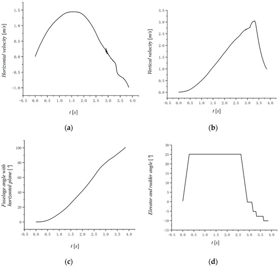 The results shown in Figure 9 indicate that the airplane can successfully follow the target trajectory during its flight. The pitch angle stabilizes to a level flight state at about 3 s, as shown in Figure 9d, corresponding to the axial and vertical velocities during the process. The results shown in Figure 10 reflect the responses of the main propulsion system and the control system over time during the aircraft’s flight movement, confirming that both systems meet the requirements for the aircraft’s high angle of departure during the flight phase.