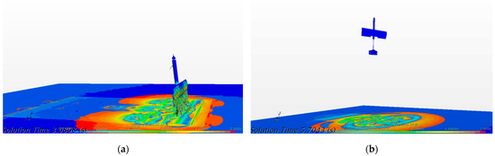 The thrust of the propeller in the underwater low-speed stable operation is 117.9 N—take 50% of the value of the thrust as the simulation of the UAAV underwater movement of the propulsive force, set the control propulsion in the UAAV propulsion out of the water to increase to the air in the thrust test of 95% of the maximum value of the thrust test, i.e., 185.1 N; elevator rudder initial angle is 0°, and the maximum adjustment of the rudder angle is ±25°, with the wing drainage cover plate. The initial angle of the elevator is 0°, the maximum adjustment angle is 25°, the starting position of the UAAV is 0 m, and the height of the water surface is 7 m; the results of the initial example section are shown in Figure 4 and Figure 5.