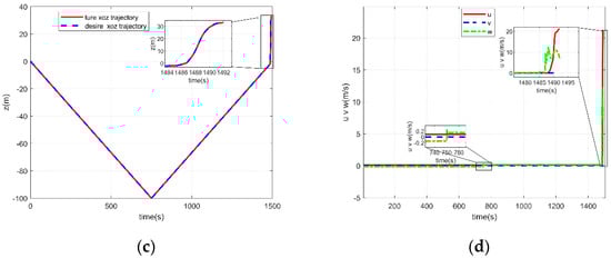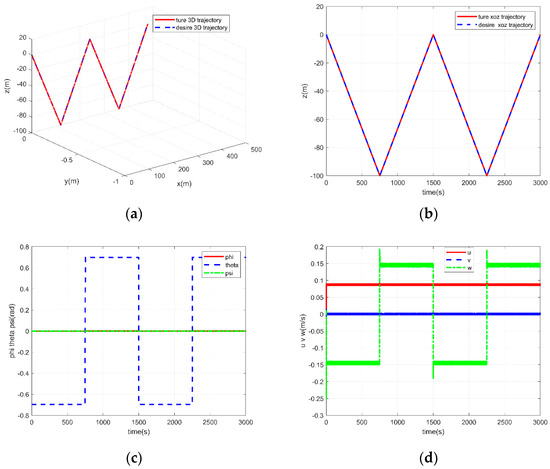 Simulation result of zigzag motion control. (a) “Zigzag” motion 3D trajectory. (b) The relationship between vehicle depth and simulation time. (c) Vehicle angle with time. (d) Vehicle speed as a function of time.