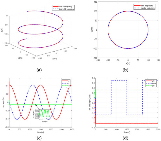 Figure 8 illustrates the stable turning motion of the UAAV. The results in Figure 8a,b show that the UAAV achieves a stable turning motion with a radius of 150 m, a cycle time of 1500 s, and a diving depth of 150 m. Figure 8c,d shows the relationship between the speed and attitude of the UAAV during the diving process with respect to the simulation time. The results show the average dive velocity of the UAAV, calculated as 0.05 units, and the periodic variation of the glide angle over time.
