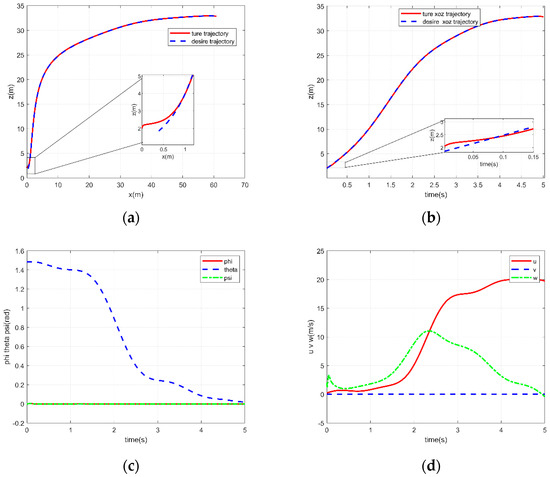 Time responses of the UAAV altitude during aerial motion simulation. (a) z-x trajectory of the vehicle’s air motion. (b) Variation of the altitude of the vehicle with respect to time. (c) Euler angle changes with time. (d) Velocity as a function of time.