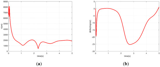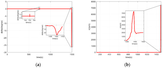 Time responses of propulsion and control systems during aircraft aerial motion. (a) The change of propeller speed with time as red color curve. (b) The relationship of rudder angle with time as red color curve.
