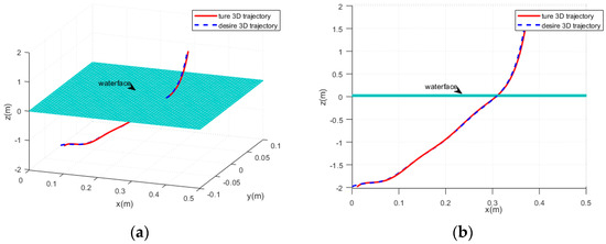 The results shown in Figure 11 reflect that the UAAV can follow the target trajectory during the water ejection process. The UAAV completes the water ejection in about 1.3 s, as shown by the propeller response curve in Figure 10b, where the propeller speed rapidly increases after the ejection, “pulling” the UAAV out of the water surface. The simulation results in Figure 10 illustrate the time response of the main propulsion system and the control system during the water ejection process.
