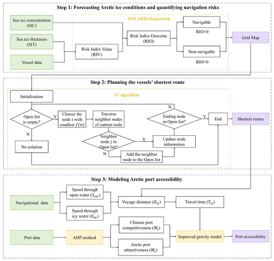 In the context of Arctic ice melt, combining the Polar Operational Limit Assessment Risk Indexing System (POLARIS) risk assessment framework, the A* shortest path algorithm, the Analytic Hierarchy Process (AHP) method, and the gravity model, a simulation framework for analyzing the accessibility of Arctic ports in the context of melting Arctic ice is proposed.