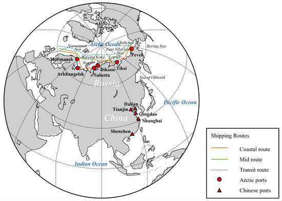 This study assessed the accessibility of five Chinese ports to Arctic ports: Dalian Port, Tianjin Port, Qingdao Port, Shanghai Port, and Shenzhen Port. The selection of these ports was based on several criteria, encompassing strategic positioning, cargo throughput capacity, and geographical significance. For example, Dalian Port assumed the role of the largest multi-purpose port in northeastern China, functioning as a pivotal trade gateway to the Pacific Ocean region. The Shanghai Port ranks among the world’s largest and busiest ports, playing a central role in China’s foreign trade. Meanwhile, Shenzhen Port is the largest comprehensive port in South China and serves as an important economic and transport center for the Pearl River Delta region.