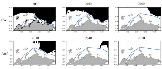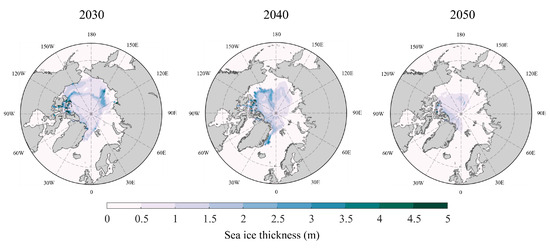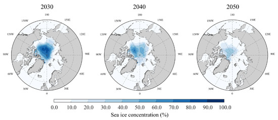 54]. We estimated future sea ice conditions in the Arctic using projected monthly SIC and SIT data for the period of 2021–2050 provided by these CMIP6 models. These models included the Community Earth System Model version 2 (CESM2), Earth System Model version 3 (EC-Earth3), FIO Earth System Model version 2 (FIO-ESM-2-0), Geophysical Fluid Dynamics Laboratory Earth System Model version 4 (GFDL-ESM4), Max Planck Institute Earth System Model version 1.2 (MPI-ESM1-2-HR), Max Planck Institute Earth System Model version 1.2 (MPI-ESM1-2-LR), Meteorological Research Institute Earth System Model version 2 (MRI-ESM2-0), and Norwegian Earth System Model version 2 (NorESM2-LM).