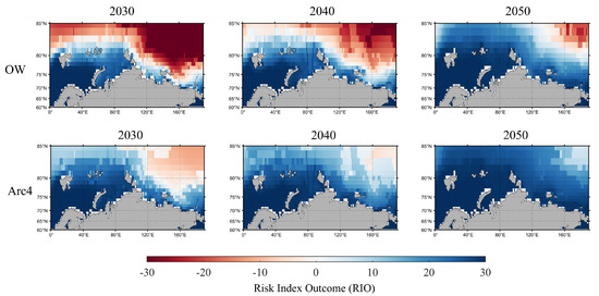 (2) In terms of navigation risk quantification, there are some differences in the regional distribution of navigation risk between OW vessels and Arc4 vessels along the NSR. The key areas affecting navigation are mainly the East Siberian Sea and the sea area around the northern part of the Northland Islands. As the study period moves on, the trend of the risk areas for ship navigation changes from complex to single, and the safe navigation of all shipping lanes is gradually realized in the Arctic sea.