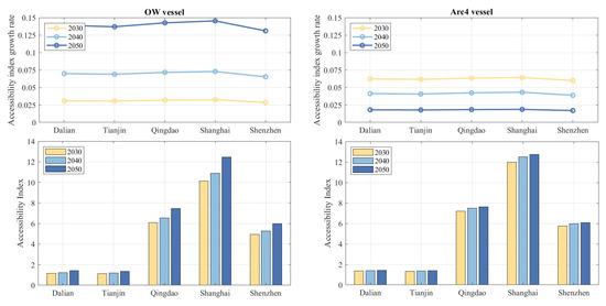(3) The accessibility of Chinese ports to Arctic ports will keep increasing from 2030 to 2050. The increase in the accessibility index in the OW vessel scenario is faster than in the Arc4 vessel scenario, mainly because the melting of sea ice extends the range and shortens the route distances for OW vessels, reducing the navigational advantages of ice-class vessels. A comparison of the accessibility indices for different ports reveals that port value is an important factor in evaluating port accessibility.