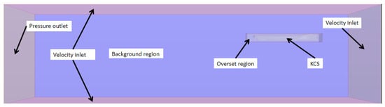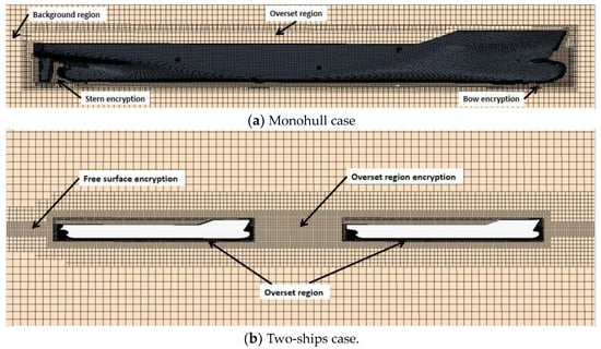 In the computational domain, the encryption is set step by step with the hull as the center. When selecting the grid size and time step, the CFL value should be ensured to be less than 1 in order to ensure the calculation accuracy, where CFL refers to Courant-Friedrichs-Lewy condition [,]. Linear interpolation is used in overlapping grids, and it is also necessary to ensure that the mesh size of the interface between the background region and the overlapping region is similar. Appropriate encryption is set at the complex bow and stern hull profiles, and the encryption is set at the free liquid surface to capture the flow field characteristics more accurately. The gridding strategy for the two-ships case is similar to that for the single-vessel case, with the difference that the encryption of the overlapping area needs to be adjusted according to the spacing between the two vessels. The grid division in this study is shown in Figure 2.