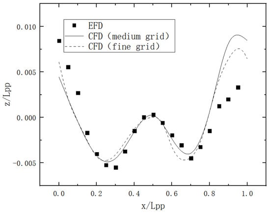 Wave height along the hull surface of CFD and EFD for medium grids and fine grids.