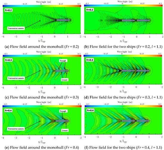 Two KCS ships with the same parameters are set up in the flow field, and the two ships follow forward and backward at the same speed and keep the interval not changing with time. The intersection point of the middle axis of the rudder bar of the following ship and the water surface is taken as the coordinate origin, and the axis direction and the computational domain settings are the same as in the case of a single ship. The unfactorized interval is defined as l = D/L, where D is the distance between the intersection point of the middle axis of the leading ship’s rudder bar and the water surface and the coordinate origin, and L is the overall length of the ship. Figure 5 shows the flow fields for the monohull case and the two-ships case at l = 1.1 and different Fr.