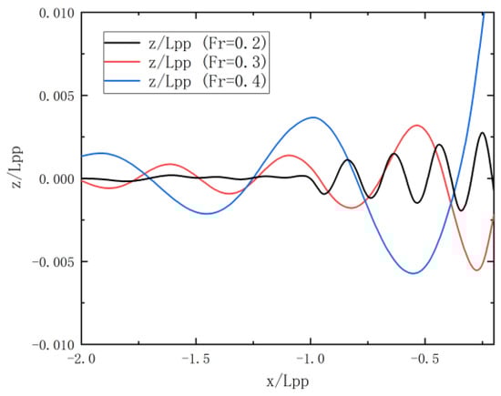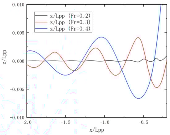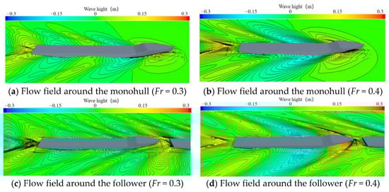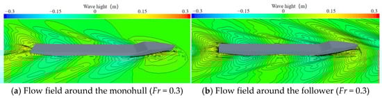 The wave height along the hull surface of the monohull case and the follower under different Fr are obtained, as shown in Figure 8. It can be found that the higher the ship’s speed, the more intense the change of the flow field around the ship is, and the wavelength is longer. When Fr = 0.2, the hull surface wave is very small, and when Fr = 0.4, the wave amplitude increases dramatically compared with the low-speed condition, and higher wave peaks at the bow and stern as well as lower troughs in the middle of the ship can be observed. For the monohull case the maximum wave height at the bow of the ship reaches 0.03022 Lpp(m), and the depth of the trough at the middle of the ship is 0.01456 Lpp(m).