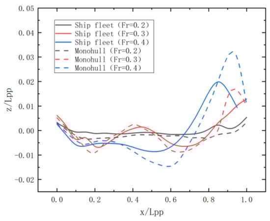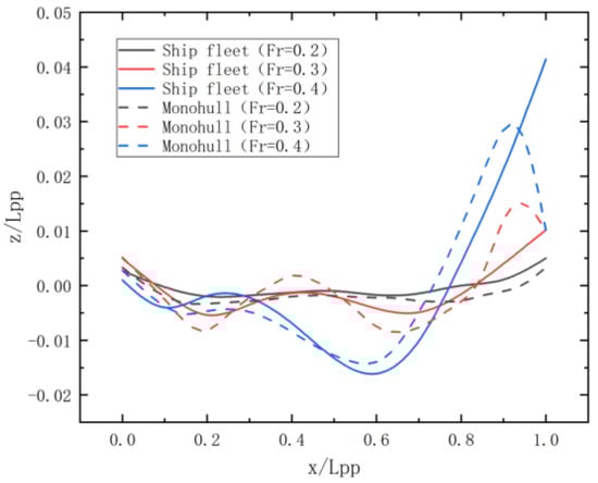 As shown in Figure 8, the wave height along hull surface of the following ship is quite different from that in the monohull case; when Fr = 0.3, the surface wave amplitude of the hull of the two-ships case is significantly reduced compared with that of the monohull case, but the opposite phenomenon occurs when Fr = 0.4, and larger wave peaks and troughs are observed at the bow and the middle of the ship, respectively, which suggests that the influence of the leading ship on the following ship exhibits different characteristics at different speeds. When Fr = 0.3, the depth of trough at midship is 0.00877 Lpp(m) and 0.00575 LPP(m) for the monohull case and the following ship of the fleet case, respectively, and the depth of trough at midship is reduced by 34.4% for the following ship under the influence of the leading ship. But when Fr = 0.4, the depth of trough at midship is 0.01456 LPP(m) and 0.01775 LPP(m) for the monohull case and the following ship of the fleet case, respectively, and the depth of trough at midship is increased by 21.9% for the following ship under the influence of the leading ship. At the same time, the peaks and troughs appear in different locations.