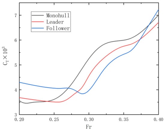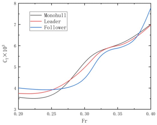 The change of followers compared to the monohull case is shown in Table 4. According to the physical phenomenon of water resistance, ship sailing is divided into wave resistance, viscous pressure resistance, and friction resistance. Among them, the wave resistance is mainly due to the influence of waves, and the ship’s surface draft is different, thus generating a pressure difference. Therefore, when the wave height of the follower changes under the influence of the leader, the wave resistance it suffers will be different. The factors affecting the frictional resistance are mainly the wet surface area and speed of the ship. When the follower is in the wake field of the leader, the wet surface area of the follower will change due to the change of the wave height around the ship, and at the same time, due to the shading effect of the leader, the speed of the incoming current it suffers from is also reduced. For the viscous pressure resistance, the effect suffered by the follower is mainly reflected in the vortex generated by the hull and propeller of the leader. These are all important factors affecting the interference between ships, and the specific effects of these factors have yet to be studied.