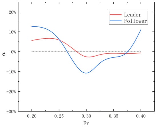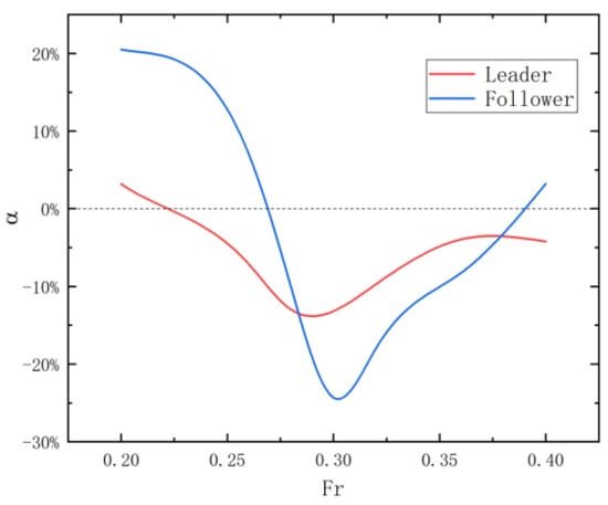 When a ship sails on the surface of the water, the bow exerts pressure on the water surface, setting off a set of waves that follow the ship forward, called the bow wave. At this time, the bow part of the ship is a high-pressure area. The stern part of the ship will also set off a group of waves with the ship forward, called the stern wave. At this time the stern part of the ship is a low-pressure area. Due to the pressure difference between the stern and the bow, the surface pressure distribution of the hull is not uniform, thus generating the wave resistance. There is a direct relationship between the magnitude of wave resistance and the speed. Figure 9 and Figure 10 show the resistance coefficients at different Fr and the change relative to the monohull case, where α is the percentage change in the resistance coefficient between the front and rear ship at different speeds compared to the monohull case. For the following ship, it can be seen that in a certain interval (0.27 < Fr < 0.38), the resistance of the following ship becomes smaller under the influence of the leading ship, and the reduction in resistance is greatest at Fr = 0.3; the resistance coefficient is reduced by 24.3%. However, when Fr > 0.38 or Fr < 0.27, the resistance of the following ship increases. The reason for this phenomenon may be that when the two ships sail forward and backward, the flow field around the following ship and the flow field behind the leading ship are superimposed on each other. When the transverse wave wavelength of the flow field at the stern of the leading ship is similar to the wavelength of the wave around the following ship and the phases are just canceled, the wave of the following ship is reduced, thus reducing the wave resistance of the following ship. On the contrary, it will increase the wave around the following ship, thus increasing the resistance of the following ship. When l = 1.1, the follower is close enough to have a significant impact on the resistance coefficient of the leader as well. When Fr is greater than 0.24, the resistance coefficients of the leader are all reduced compared to the monohull case, with the largest reduction occurring at Fr = 0.3, which is 13.2%. It shows that the interaction of the two ships can have a significant effect when the distance is close enough.