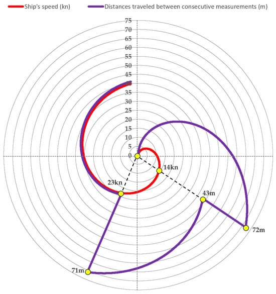 At present, the easiest way to track ship traffic is through the AIS system, as all large ships are equipped with a radio system that automatically transmits dynamic and static information about the ship. The position of the ship, its speed, and even its rate of turn are transmitted very frequently; a normal ship, while underway transmits at least 6 positions per minute. When maneuvering, the frequency increases by threefold, and when the ship is at anchor or in port, it transmits the data once every three minutes. Although the rate of turn (ROT) is an AIS function, this value is not displayed correctly in some messages, and therefore may only be used sometimes. The data quality is better for large vessels displacing over 50,000 tons, which must be equipped with an ROT indicator that provides more reliable reports on the rate of turn transmitted by the AIS system. A coastal AIS base station can also interrogate the ship’s AIS transmitter to speed up the transmission, up to every two seconds, which is especially useful when the ship is maneuvering or when ships at anchor are exposed to bad weather. So, when we track a ship on its course, we generally have a position at least every 72 m (without taking into account the GNSS positioning performance and possible jamming or spoofing activities), and the exact data are given by Equation (1) and Figure 1 presenting a plot of all the ship distances traveled between consecutive measurements.