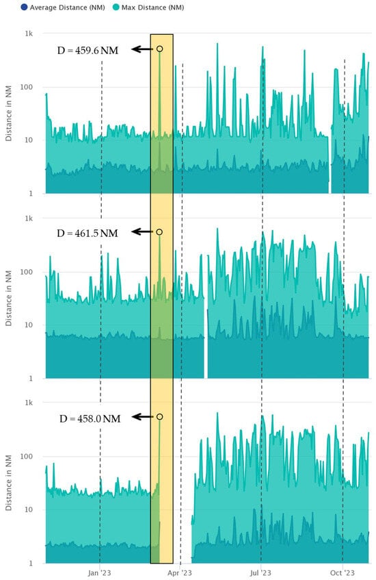 An example of an exceptional AIS range is shown in the following figure, depicting the average and maximum receiving distances of three AIS stations during the period from October 2022 to 2023. All three stations are located near Costanța at similar altitudes, namely, Costanța Station (h = 41 m), Constanta Kalimbassieris Maritime Station (h = 20 m), and Offshore Costanța Station (h = 10 m). Figure 3 shows the extreme range of the AIS system on 9 March 2023, when it exceeds 450 nautical miles. One can speak of atmospheric disturbances, but other stations in the western part of the Black Sea do not have such a range. Nor can one imagine special conditions in March, known as the time of the summer solstice. All three stations are located at low altitudes; their realistic range, according to Table 1, is not more than 40 NM, even for communication with a large merchant ship, where the AIS antenna can be placed at a height of 60 m above sea level.