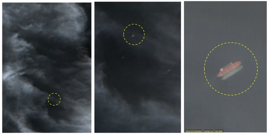 As for non-cooperative observation systems, the main tools used for maritime surveillance are optical cameras, infrared cameras, and radar. These can be deployed from land, ships, aircrafts, or satellites. Each type of sensor and platform has its strengths and weaknesses in terms of features, such as spatial resolution, update rate, range, coverage, etc. Satellite-based sensors have the particular advantage of remote access, global coverage, regular updates, and comprehensive data collection, making them the only viable option in some scenarios and the most economical in others. The use of satellite imagery is therefore an essential tool for locating ships at sea. In particular, satellite-based radar imagery, usually in the form of synthetic aperture radar (SAR), is very popular for monitoring ships at sea; ships can be detected relatively easily, even through clouds or in the absence of daylight [,]. However, interest in the capabilities of optical imaging for maritime surveillance has increased greatly in recent years, perhaps largely due to the growing number of optical imaging satellites. Another technology useful for light detection is the visible infrared imaging radiometer suite (VIIRS) generaly used for detecting ships at night based on light intensity []. A detailed literature review of the methods used for detecting and classifying ships using space-based platforms can be found in []. There are several satellite platforms for ship detection purposes; but, in this study, we focused on the Sentinel 1 (SAR) and Sentinel 2 (optical) platforms of the European Space Agency’s Copernicus program, as they provided accurate quality data and were freely available. To incorporate our scent-based research into further studies, we could also be provided with data from ESA and third-party missions for which we have already applied. This would further improve the ability to accurately represent the ship’s position and thus reduce the possibility of the falsification of the presented data on the ship’s position. Ship detection with the Sentinel 1 mission (C-band radar) falls into the category of non-cooperative systems and enables the detection of ships that do not have AISs or other vessel monitoring systems on board, e.g., the VMS of fishing vessels. With two platforms (Sentinels 1A and 1B), the system has a revisit time of only a few days, which is a great opportunity for ship detection. The most suitable mode for ship detection is the interferometric wide angle (IW), which covers an extended area with a width of 250 km at a spatial resolution of 20 × 22 m and ensures the detection of larger ships, such as shuttle tankers, in almost all weather conditions. The most suitable polarization for object detection at sea is VH (Vertical transmit-horizontal receive). The Sentinel application platform (SNAP) was used to analyze the SAR images in this study. SNAP is a pixel-based algorithm that uses a systematic method to identify and eliminate false alarms from objects on the sea surface. The constant false alarm rate (CFAR) method was used to determine the threshold for an object to be indicated as a vessel at sea.