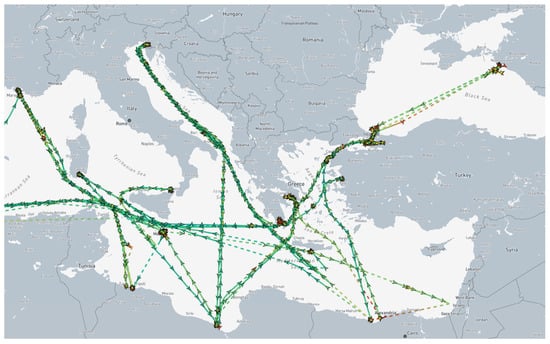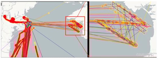 To confirm the deliberate deactivation of the vessel’s AIS system, the reception of the AIS base stations must first be checked. However, it could be assumed that there was a deliberate deactivation, as in this case, all other vessels in the vicinity of New England were seen by the AIS signals. To confirm the AIS coverage of the STS site, we provided the AIS reception statistics for the Mediterranean and Black Sea compiled by the European Maritime Safety Agency (EMSA), where the Mediterranean AIS Regional Exchange System (MAREΣ) was available []. The estimated monthly AIS coverage of the MAREΣ is represented by layers, as shown in Figure 7.