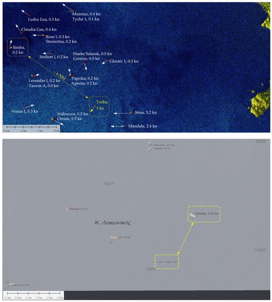 Sentinel-1 images were available and captured the situation just minutes before the apparent near miss. Using SNAP application, we processed the image and exported the detected vessels to the GIS application, into which we also imported the AIS data. It immediately became clear that there was no Turba tanker in the vicinity of the Strea vessel, which was actually performing an STS operation with the Simba tanker, i.e., Turba was showing an incorrect position; at this time, the offset was 6 NM, as shown in Figure 12. Furthermore, the movement and orientation of the vessel did not match the movement of the Simba tanker. We also checked the optical images, and the following day, 20 September 2023, we observed the same situation: Turba was still falsifying its AIS transmission. Such activities are very dangerous and the maritime authority should significantly increase its vigilance and sanction such culprits.