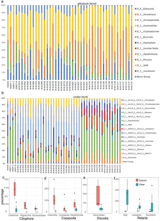 Eukaryotic microbial community structure. The samples were obtained by two different sampling tools: Niskin bottles and MISNAC. The ISMIFF-1 and -2 samples were not treated with cell lysis butter in MISNAC filtration chambers but were preserved with RNALater. The ISMIFF-N sample was maintained in a MISNAC filtration chamber without treatment before being brought on board. The community structures for the samples (see Table S1) from the MISNAC filtration membranes and columns after cell lysis are displayed separately. The eukaryotic microbial communities were classified using 18S V9 miTags from the metagenomes for these samples. The phylum (a) and order (b) classifications of ASVs were performed with reference to the SILVA v132 database. The minor group includes the phyla or orders with relative abundances <1%. The relative abundances of the taxa at the lower levels were compared between the MISNAC column samples and the others (c). The major lineages that showed a significant difference between the MISNAC column samples (Column) and the others (Spearman test, p < 0.0001) are shown for Copepoda (c), Discoba (d), Ciliophora (e), and Retaria (f). &: a sample from ~590 m depth; #: ~1100 m depth; *: ~3100 m depth.