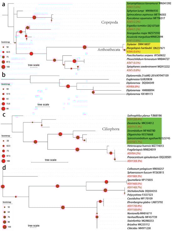 Phylogenetic tree and average abundance of major Metazoa, Discoba, Alveolata, and Retaria ASVs. The maximum likelihood phylogenetic trees were reconstructed using the representative joint 18S miTags for the major ASVs from Metazoa (a), Discoba (b), Alveolata (c), and Retaria (d), along with the references from the NCBI. Average relative abundances of the ASVs in all the samples are shown in parentheses following the ASV IDs. The green color in (a) represents Copepoda, while the yellow color represents Anthoathecata. The green color in (c) represents Ciliophora. The red dots shown on the tree denote the bootstrap values.
