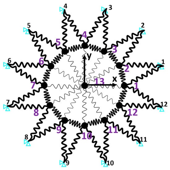 The spring-particle system shown in Figure 1 is used as the analysis model; this approach is simple cyclic symmetric structure. The mass of each particle is 100 kg, and the stiffness coefficients of each ring spring and each axial spring are 3.15 × 105 N/m and 1.05 × 107 N/m, respectively. The particle is allowed to move only in the plane, which signifies that the structure has 26 degrees of freedom. MATLAB (9.5 R2018b) was used to model the structure and for the detuning simulation and data calculation. The modal frequencies of the structure are presented in Table 1. For this harmonic structure model, only 1st, 12th, 15th, and 24th modes are non-repeated modes, while every two frequencies of the remaining modes constitute a degenerate mode pair. In addition, there is minimal distinction between adjacent frequencies, making it prone to the occurrence of modal localization phenomenon.