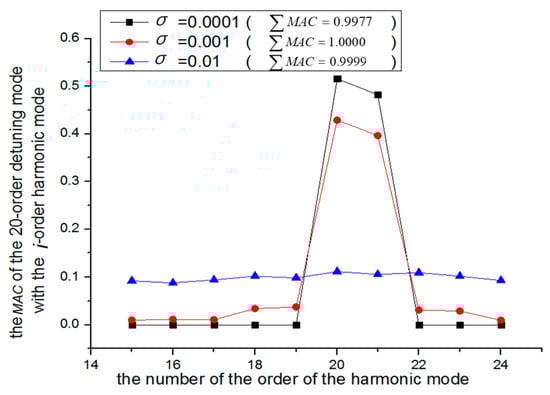 where is the d-order detuning modal vector; , , and are the i-order, j-order, and k-order harmonic eigenvectors, respectively; and signifying , and are the same as in Equation (8). The summation of the model assurance criterion (MAC) can be expressed as