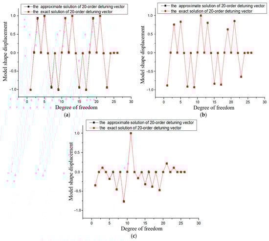 In fact, each detuning modal vector can be obtained by linear superposition of all the harmonic vectors, and the approximate solution of the detuning vector can be obtained by linear superposition of parts of the harmonic ones. Figure 3 presents the approximate and exact solution of the 20th detuning modal vector. The results show that (1) there are minor differences between the approximate and exact solutions, meeting practical engineering requirements, and (2) the modal localization phenomenon already occurs when the value of is 0.01.